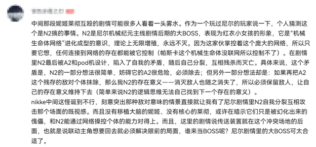 限时活动「OuteR:Automata」则是一套带有剧情的限时活动玩法,妮姬们将与「2B」等来自《尼尔》IP的角色相遇,并肩作战。活动剧情紧紧围绕着双方IP的故事氛围展开,熟悉《尼尔》的玩家能从中品到非常熟悉的情怀。有玩家专门写长评事无巨细地分析剧情细节,并向不熟悉《尼尔》的玩家科普故事设定,仿佛在《胜利女神》这里又吃了一顿《尼尔》的「加餐」。
